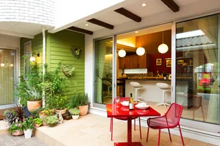 回廊を取り入れた店舗兼住宅のオリジナリティー溢れる間取り。中庭は立壁の無いアイアンを取り入れた解放感溢れる空間。中庭は、ツインのシンボルツリーや対に配置された鉢植えなど、クラシカルなヨーロッパの印象を取り入れた植栽になっています。さらに、外構・植栽スペースは、モデルルームの中で一番の広さを有効に、石畳の街中を演出するように花壇は地植えであるため、熊谷・高崎展示場とは違ったドムスデザインカーザの姿を見ていただける演出をしております。